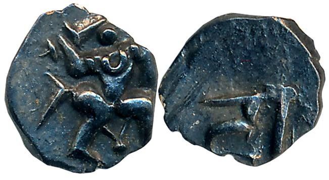 Nidugal Cholas, Irungola III, Silver Tara, 0.15g, Obv: Warrior swinging dagger in his right arm to right, Rev: Devanagari letter “DA” the initial of Danava murari Bantaru. About extremely fine, rare.