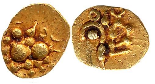 Nolambas of Nolambavadi, Anonymous, Gold 1/4 Fanam, 0.08g, Obv: Caparisoned Nandi seated couchant facing left, Sun and Crescent symbols above, Rev: Elephant goad and Kannada legend “Bhu”, a short form of Bhujabala. The title Bhujabala is adorned by the Nolambas, Telugu Chodas and many other kings of the South Indian dynasties. Extremely fine, extremely rare.