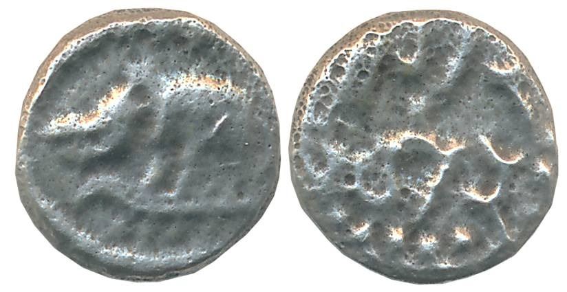 Rashtrakutas, probably attributed to Gunatunga, Silver, 0.46g, Obv: Boar to left, Rev: Legend in two lines within dotted circle (Pieper# 3779). Very fine+, rare.