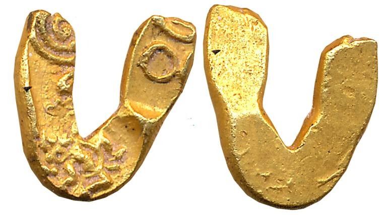 Shilaharas of Kolhapur or their Feudatories, Anonymous Gold U Shaped Fanam, 0.53g, Uniface, Three punches - running Garuda / warrior on the apex, Ankusha and Kannada letter “Shri” on one lateral arm and Kannada legend “(Kā)ra” on the other on obverse. Extremely fine, very rare.