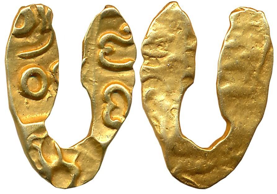Shilaharas of Kolhapur or their Feudatories, Anonymous Gold U Shaped Fanam, 0.50g, Uniface, Three punches - running Garuda / warrior on the apex, Kannada legend “Ude” on one lateral arm and Kannada legend “Kāra” on the other on obverse. Extremely fine, very rare.