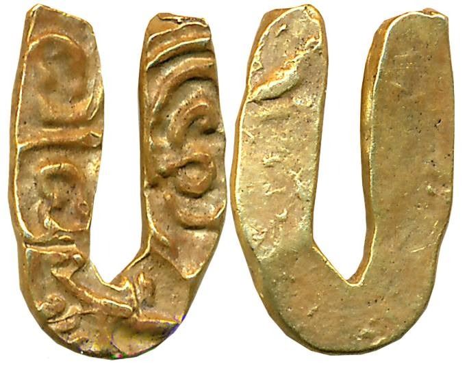 Shilaharas of Kolhapur or their Feudatories, Anonymous Gold U Shaped Fanam, 0.49g, Uniface, Obv: three punches - running Garuda / warrior on the apex, Kannada letter “Dā” and whorl design on one lateral arm and Kannada letter “Shri” on the other on obverse. Extremely fine, very rare.