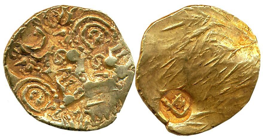 Telugu Chodas of Nellore, Gold Gadyana, 3.43g, Punch-marked type with nine symbols, 1x ‘Elephant goad flanked by Sun and Moon’, 1x “Bhujabala” written in Kannada, 5x ‘Lion standing and facing left with raised’ punch inclusive of central punch, 2x “Sri” in Kannada. Rev: ‘Ma’ in Kannada, the counter punch mark. Weak struck else fine, very rare