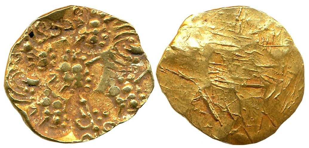 Telugu Chodas of Nellore, Gold Gadyana, 3.48g, Punch-marked type with nine symbols, 1x ‘Elephant goad flanked by Sun and Moon’, 1x “Bhujabala” written in Kannada, 5x ‘Lion standing and facing left with raised’ punch inclusive of central punch, 2x “Sri” in Kannada. Fine+, rare