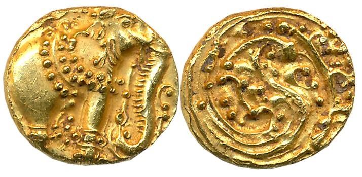 Western Gangas of Talakadu, Anonymous Gold Gajapati Varaha- Hon, 3.92g, “Elephant” type, Obv: Caparisoned Elephant, standing facing right, Kannada legend “Shri & Ma” above the back, Rev: Ornamental floral scroll (Mitch# 193). Extremely fine, rare.