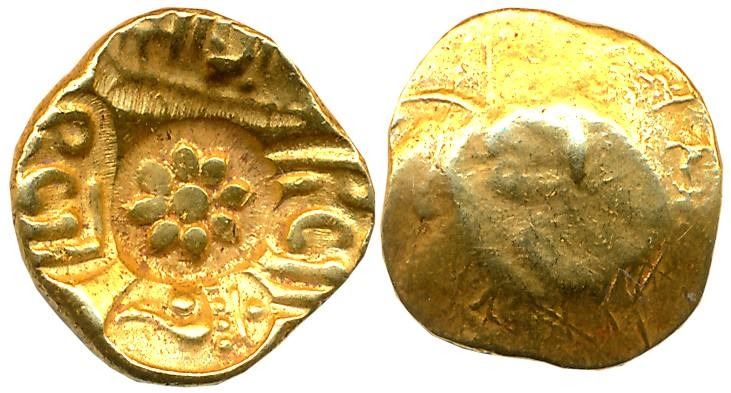 Yadavas of Devagiri, Singhana Deva, Punch Marked, Gold Gadyana Padma-Tanka, 3.82g, Uniface, 2 X Kannada letter ’Shri’, 1 X Shankha or Conch shell and 1 X Punch of Devnagari legend “Shri Singhana” along with an arrow symbol below (Mitch# K&A 287 type). Extremely fine, Scarce.
