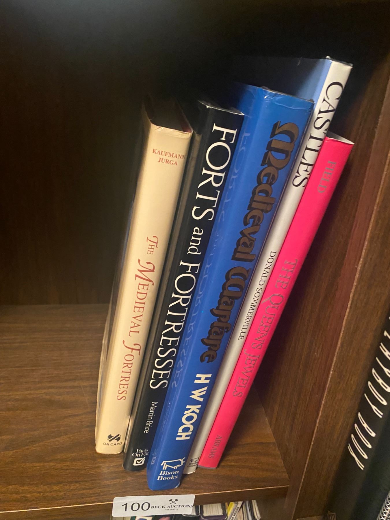 Includes an assortment of books about the Medieval era, castles, fort/fortresses, and an illustrated book of Queen Elizabeth II's jewelry collection