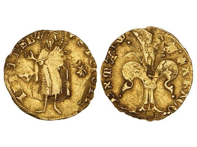 Medieval Coins: Catalonia-Aragón - Florí. MARTÍ I. MALLORCA. Anv.: SIOHA-NNES B M. Rev.: ARAGO-REX MAR. 3,39 grs. Marcas losanje ajedrezado y venera (sólo en anverso). RARÍSIMA, dos ejemplares conocidos. Cru.VS-falta; CrCo-56. MBC.