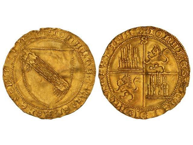 Medieval Coins: Kingdom Of Castile And León - Dobla de la Banda. JUAN II. SEVILLA. Anv.: IOHANES*DEI*GRA*REX*LEGIONIS. Escudo de la Banda con leones en los extremos. Rev.: IOHANES*DEI*GRA*REX*CASTELLE. Castillos y leones cuartelados, encima S. AU. (Golpecitos en canto, pequeña rayita en anverso). FAB-617.1 var. leyendas. EBC-.