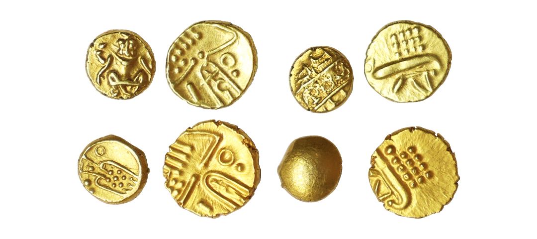 Medieval, Group of Gold Fanams, 1). Mysore, Kanthirava Narasaraja, 0.40 gms, 2). Travancore (16th-18th Century AD) 0.40 gms, Viraraya Type, 3 & 4). Vira Raya Type, 0.38 gms, & 0.38 gms,