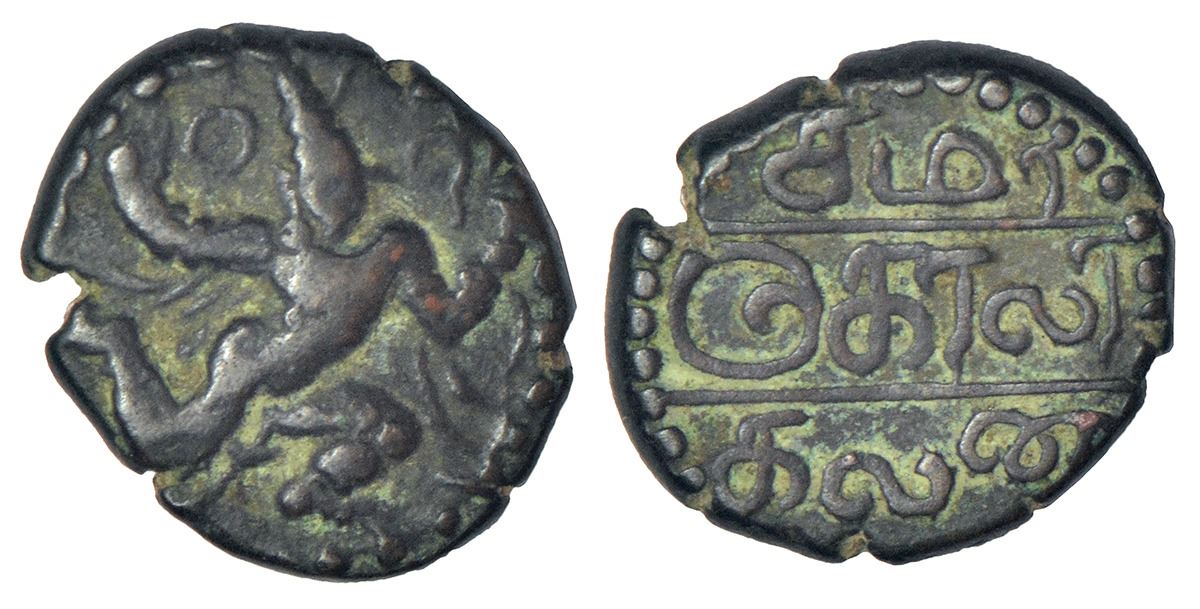 Banas of Madurai as feudatories of Vijayanagar, copper coin in the name of 'Samara kolakalan', (c.1400-1500 AD), Ganesh Tamilnadu 8.10, 3.38g. Obv: Garuda running right holding a serpent flanked by conch and discus. Rev: Tamil legend Samara / Kola / Kalana in three lines.