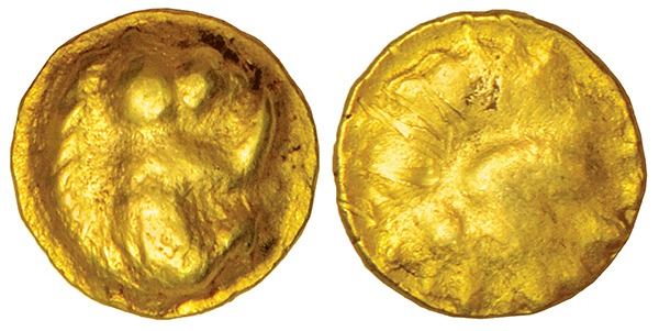Chalukyas of Badami or feudatories, unattributed and uninscribed gold fanam, (700-800 AD), 0.40g. Obv: Hanuman seated in profile, facing right. Rev: Plain.