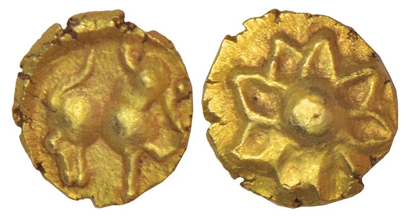 Chalukyas of Kalyana or feudatories - uninscribed gold fanam, (c.1100-1200 AD), not in Ganesh or MCSI, 0.38g. Obv: Lion with gaping mouth and raised paw, facing right. Rev: Stylized eight-petal lotus.
