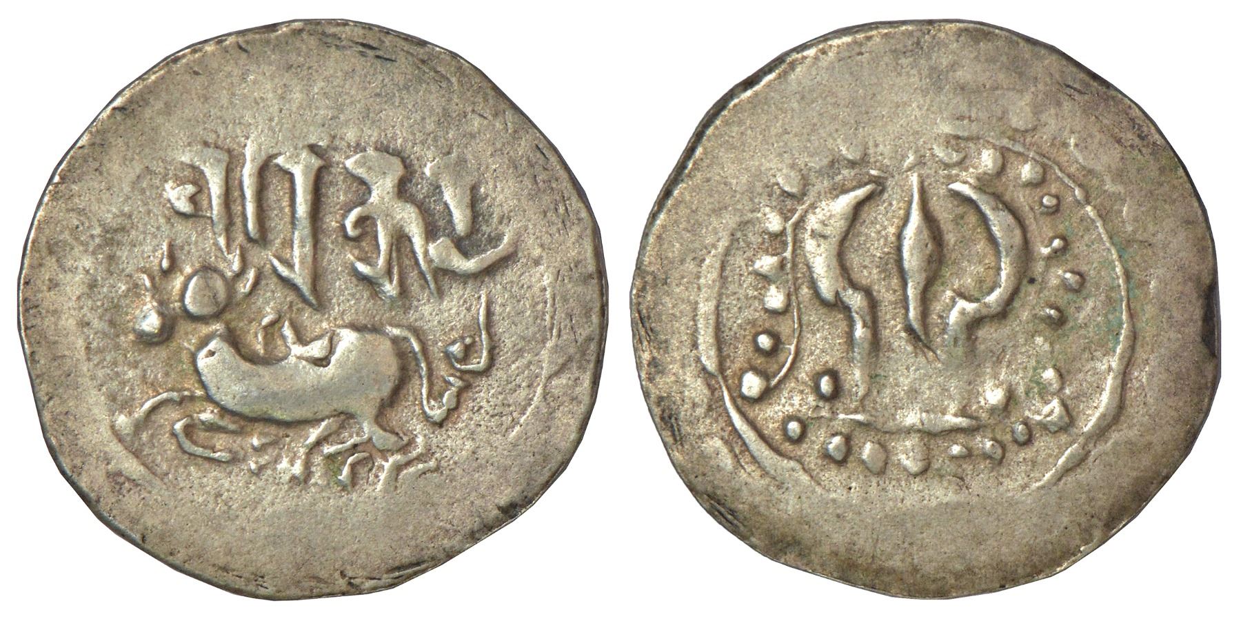 Eastern Bengal/Arakan region, silver unit of 'Harikela' type coinage (issued 750-850 AD), MNC 503-505, 5.76g. Obv: Bull seated couchant facing left, legend Harikela above; crude figure of Sankha shell behind the bull's rump. Rev: Ornate Shrivatsa symbol, surrounded by beaded garlands.
