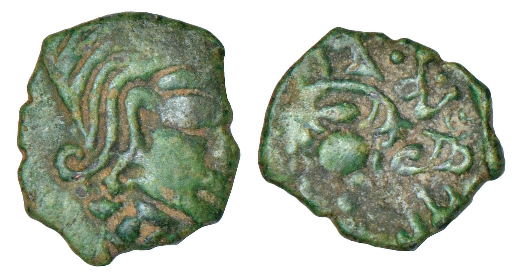 Medieval Gujarat, unattributed coin copying Gupta/Kshatrapa type, (600-700 AD), 1.15g. Obv: Bust of king facing right similar to Gupta/Kshatrapa coins. Rev: Kalasa or vase of plenty placed above a foliate motif, late brahmi legend …Chandrash- (or shri)la…