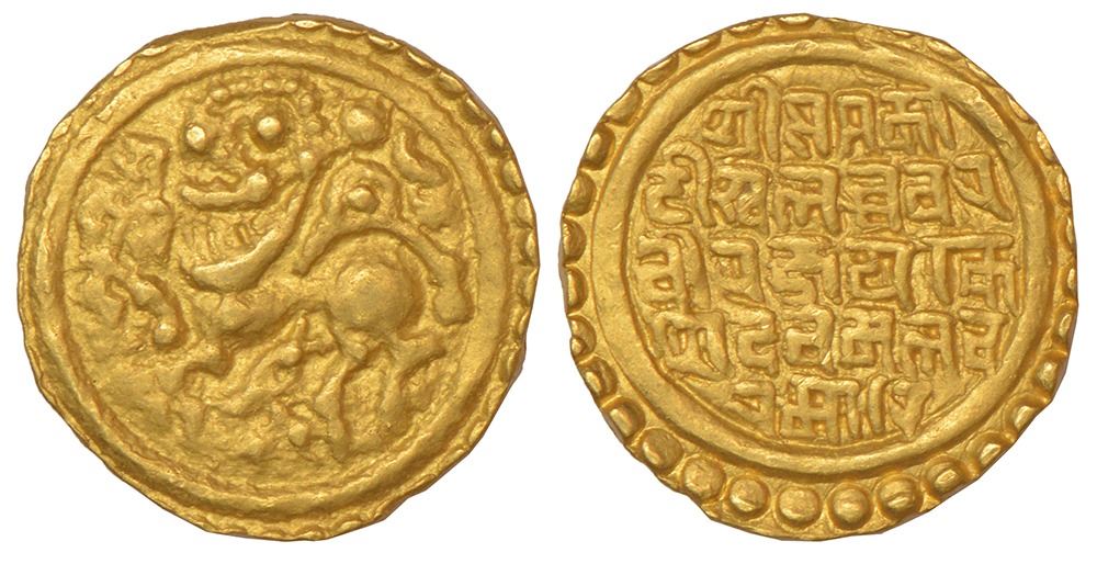 Kadambas of Goa, gold gadyana of Jayakesi III (1186-1213 AD), cyclic year 'Prajapati', 4.39g. Obv: Roaring lion facing left, sun and moon behind rump, name of cyclic year (Samvatsara) in front. Rev: Devanagari legend Shri Saptako/ tishwa labdhavara/veera Jayake/si Deva Malava/ramari in five lines.