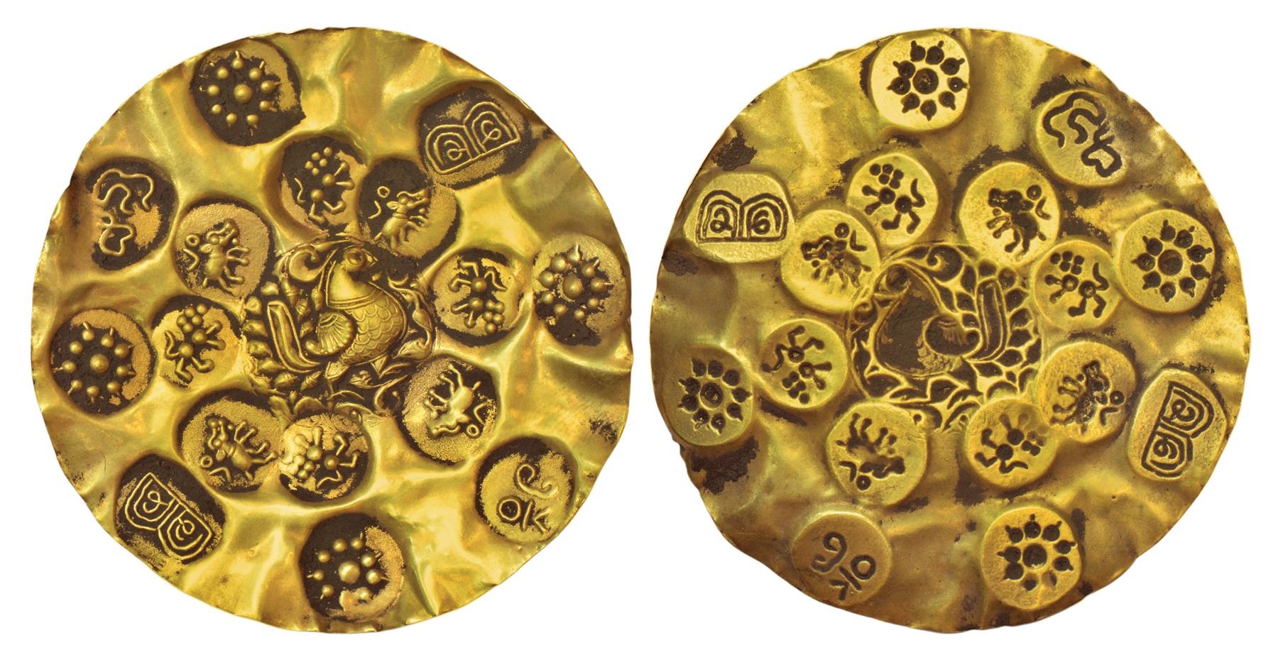 Kakatiyas of Warangal, Prola-II (1110-1158 CE), Gold PMC, One-and-a-Half Gold Gadyana, Bird Hamsa type, 5.82g, Height: 57.65mm, Width: 56.88mm. Total of 17 repousse punches elegantly struck on the obverse of a cup shaped circular flan which is so broad that it draws immediate attention from far away distance. The beautifully struck flan mimics lotus flower, the symbol of wealth. This coin has a unique combination of Boar, Lion and Lotus punch sequences. The central punch shows right facing Hamsa bird with floral ornamentation around, the vahana of Goddess Saraswathi. The circumfluent punches struck on the outer periphery consists of 2x Sri-Sri, 1x 'Manda' and 1x 'lika' punches inscribed in Kannada, and 4x Lotus symbol punches alternating between the legend punches. Surrounding the central punch, there consists of 8x alternating Boar & Lion symbol punches. The boar is shown standing facing right with sun and moon above and Lion is shown walking facing right with lifted forepaw.