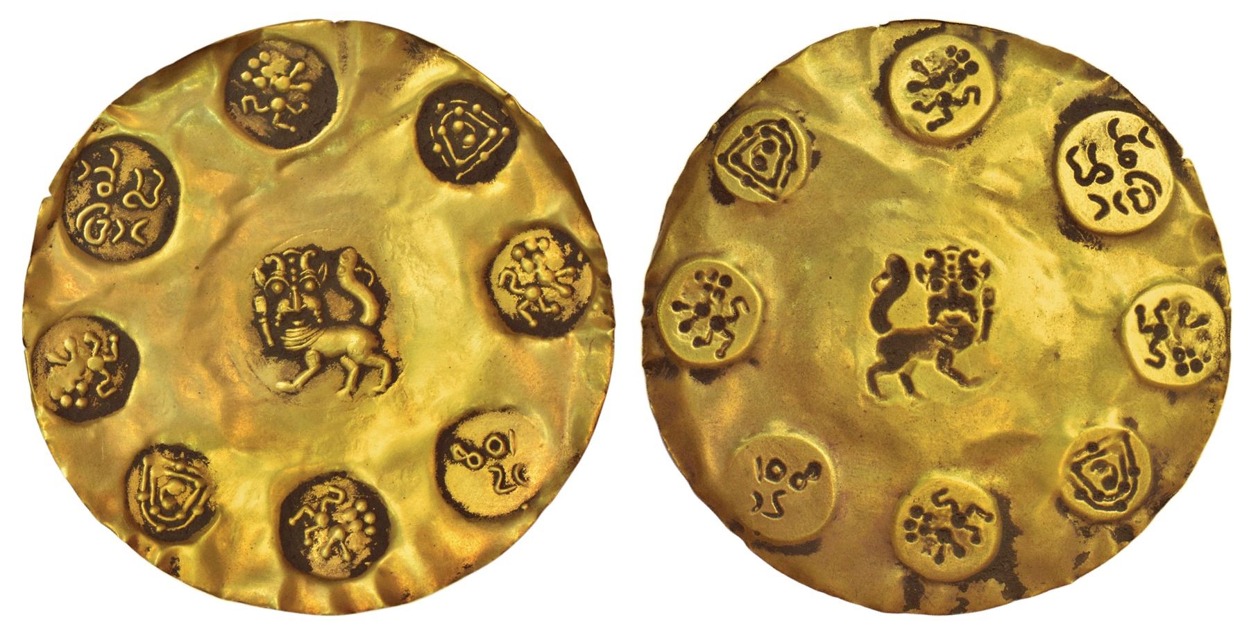 Kakatiyas of Warrangal, Prola I (1052-1076 CE), Gold PMC, One-and-a-Half Gold Gadyana, Shardula type, 5.82g. Height: 57.12mm, Width: 57.64mm. Total of 9 repousse punches hammered on a thin broad flan. The obverse consists of