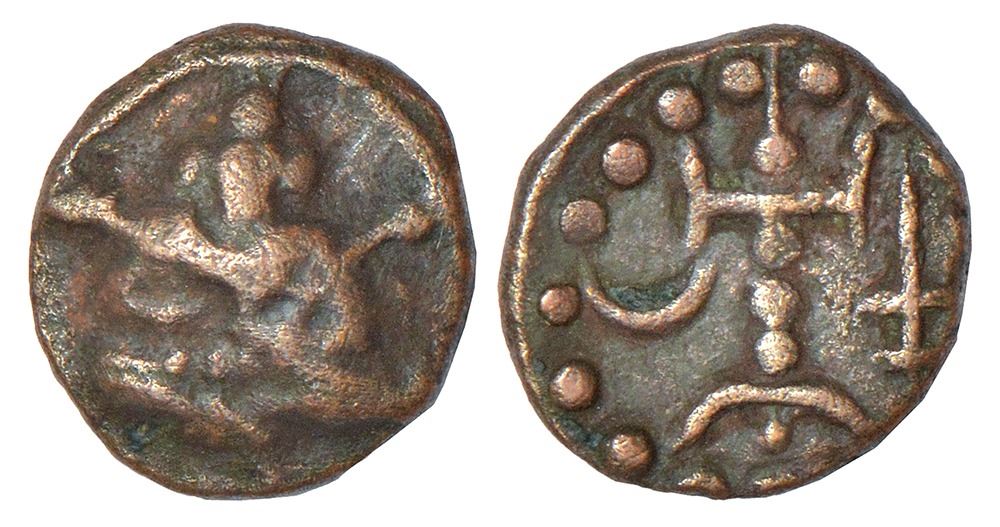 Kongu Cheras - uninscribed and unattributed copper kasu, (c.13th cent. AD), MCSI 430-434, 1.16g. Obv: stylized Narasimha seated facing. Rev: a trisula-like lamp on pedestal in the centre, a sword to right and a crescent to left.
