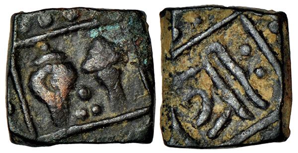 Late medieval Gujarat, unattributed copper coin, most likely a Chudasama/Vaghela issue from peninsular area, (1000-1200 AD), 1.49g. Obv: Vaishnavite symbols, Shankha and mace (Gada) in a rectangle. Rev: Nagari letter Shrih in a rectangle.