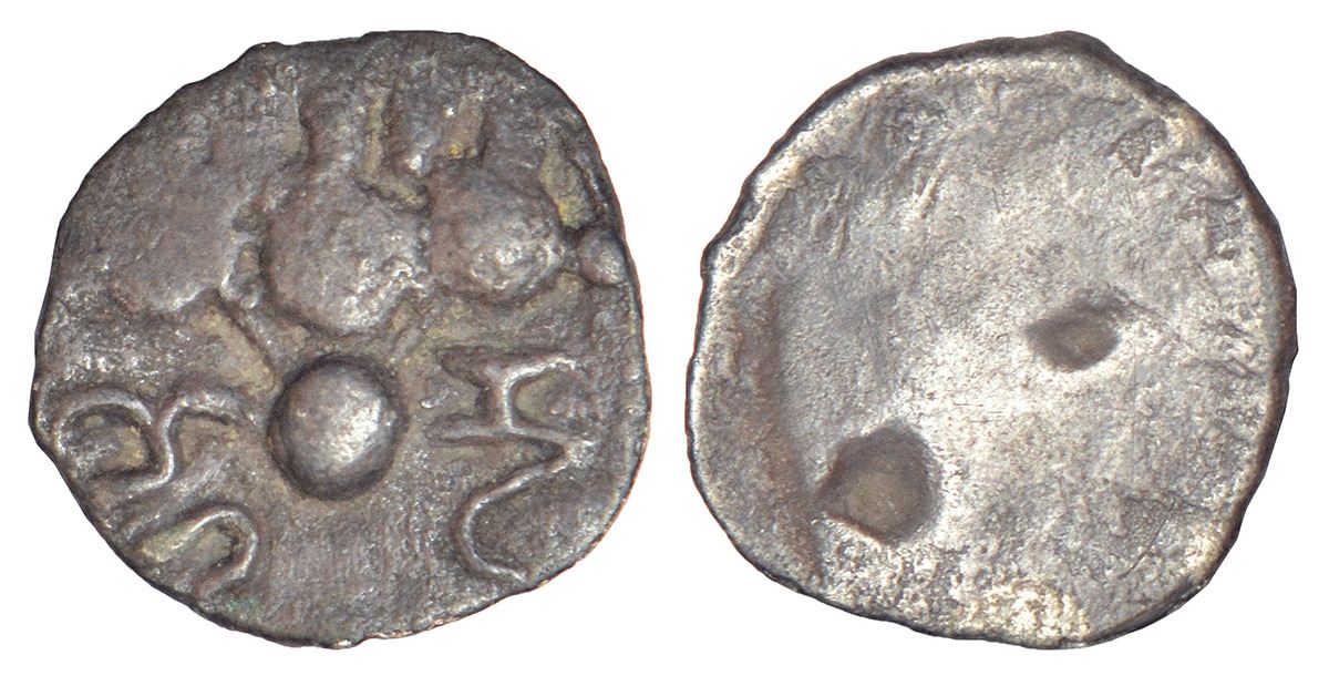 Medieval Gandhara (c.600-700 AD) - anonymous and unattributed silver Dramma Coin, unpublished in major catalogues, 1.12g. Obv: Brahmi letters Ho and Nya below a line of bold dots in 3/1 configuration. Rev: plain.