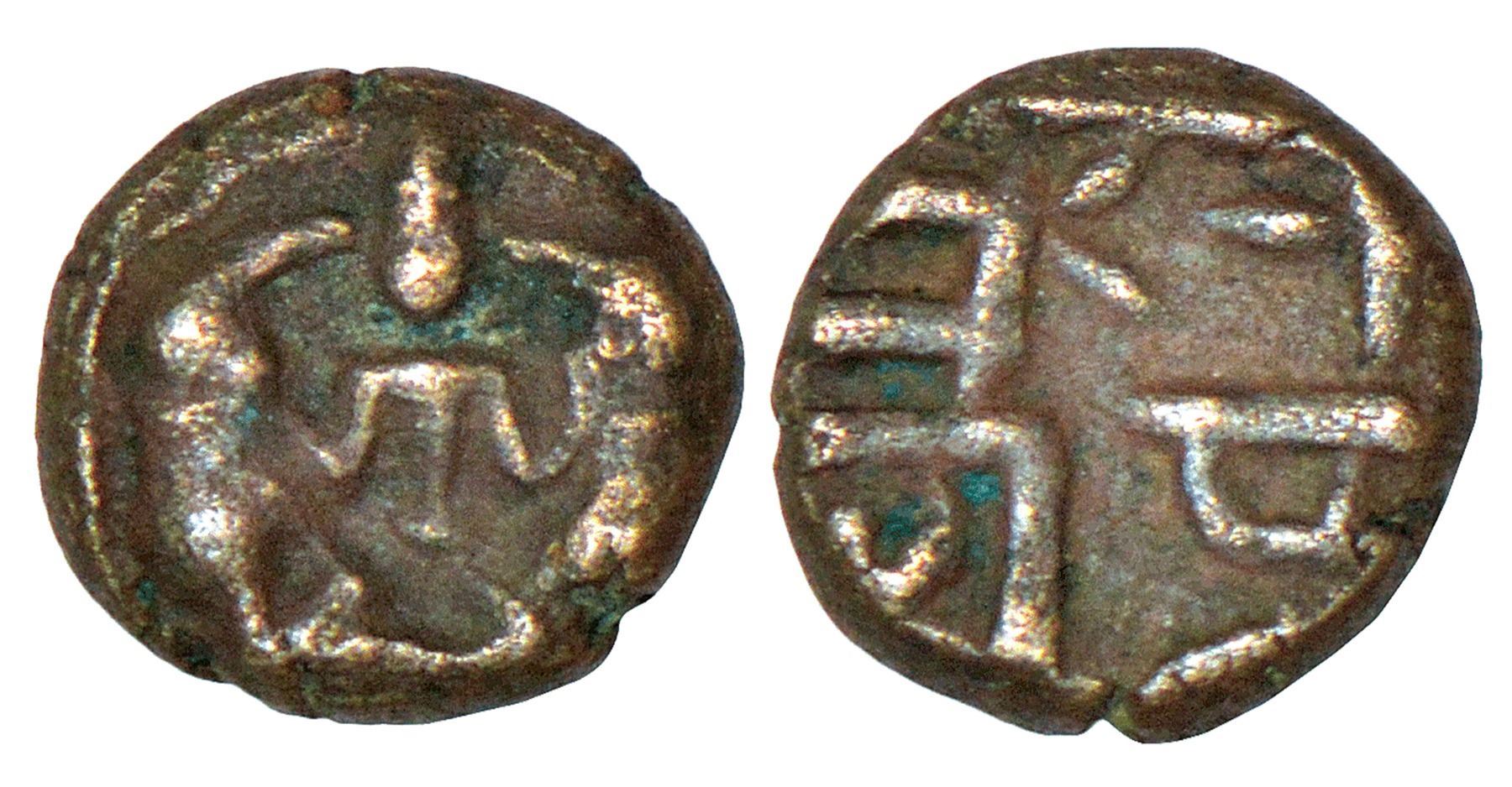 Nayakas of Thanjavur, copper ½ cash of Vijaya Raghava Nayaka (1635-1673 AD), 'Gajalakshmi' type, unpublished in major sources, 1.68g. Obv: Gajalakshmi seated cross-legged facing front. Rev: Nagari legend Vi sa…/ Ra gha… in two lines.