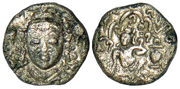 Rashtrakutas(?), unattributed silver dramma from Central Maharashtra, 0.42g. Obv: Full frontal bust of a king, wearing hairbun, Chudamani ornament, heavy earrings, and necklace. Rev: Seated figure of Kubera in an iconic style, with delicately carved Prabha feature at the back, and a Kumbha (vase), symbolic of a wealth repository to right; Brahmi letters Shri (Na)… at 2 o'clock. Hitherto Unique & Unpublished in most sources.