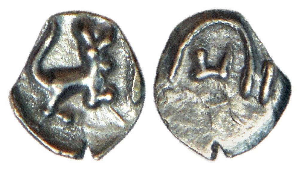Uncertain South Indian dynasty - anonymous silver ¼ tara, (c.1200-1300 AD), not listed in major publications, 0.10g. Obv: small stylized lion. Rev: Kannada numeral 1.25 with a small additional feature.