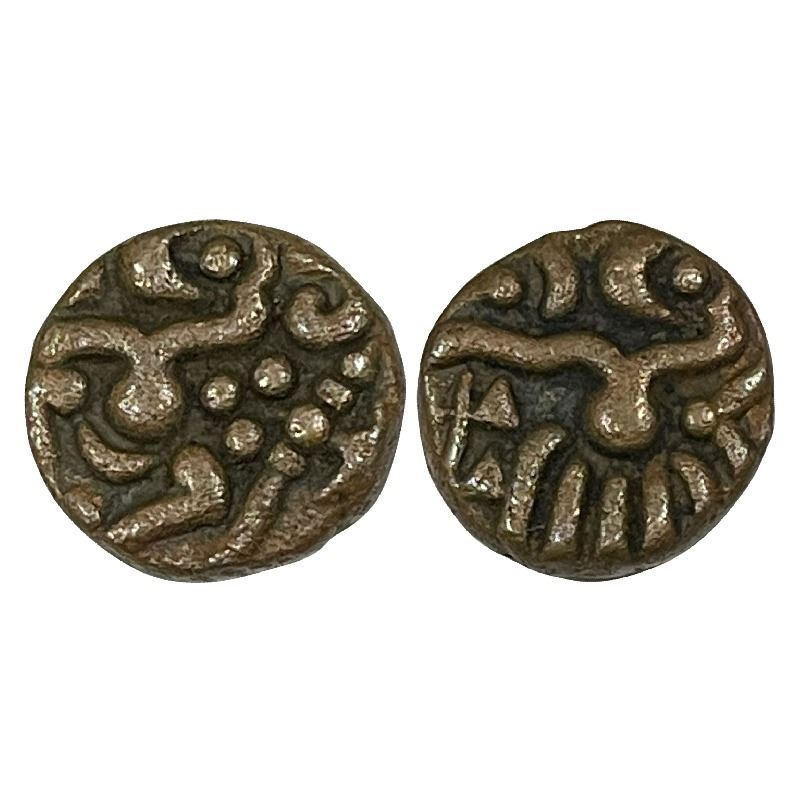 Venad Cheras, Anonymous Issue, Copper Kasu, 3.65gms, Obv: Chola style king seated facing to right side beside battle-axe above Tamil letter, Rev: Chola style standing king with lozenge symbol to right. (Mitch, T&K 453). About Very Fine, Rare.
