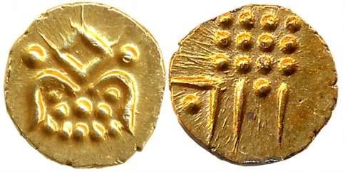 Venad, Kaliyanpanan, Gold Fanam, 0.37g, The lines and dots on the Kalipanam are fancifully consider to represent the feet, toes and naval of Lord Shri Padmanabha (Beena S# 27.2). Very fine, scarce.