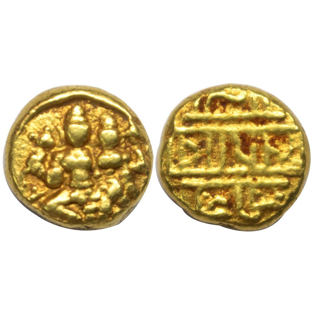 Medieval India, Vijaynagar Kingdom, Harihara II, (c. 1377-1404 AD), Gold Varaha, 3.34Grms, OBV: Vishnu seated in padmasana with his wife Lakshmi sitting on his left, Vishnu is holding discus and conch, Rev: Nagari legend in three lines ?Sri pra tapa deva raya. (K Ganesh # 40).