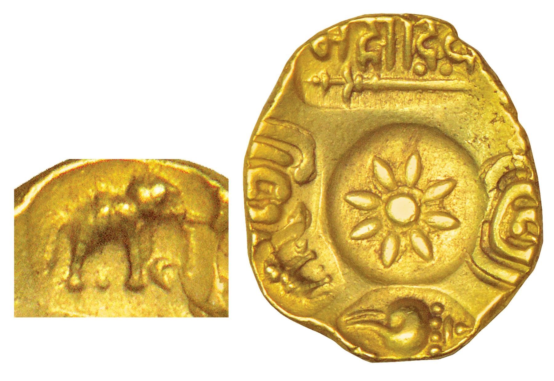 Yadavas of Devagiri, Mahadeva (1261-1270 AD), gold punch-marked Asu or 'Padma Tanka', MSCI-I no. 288, 3.81g. Obv: Six punches: 2x kannada letter 'Shri', 1x sankha shell, 1x lotus in centre, 1x elephant & 1x nagari legend Mahadeva with a sword below.