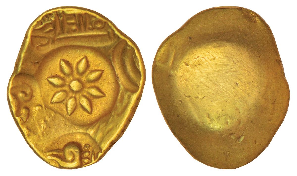 Yadavas of Devagiri, gold punch-marked Asu or 'Padma Tanka' of Ramachandra (1270-1311 AD), 3.58g. Obv: Five punches: 2x Kannada letter 'Shri', 1x Sankha shell, 1x lotus in center and 1x Devanagari legend Shri Rama with a bow below.