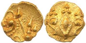 Santaras of Santalige, Anonymous, Gold Fanam (Hana), 0.38g, Obv: Lion facing right, Rev: Mace (Gada) accosted by Conches (Shankh). Extremely fine, rare.