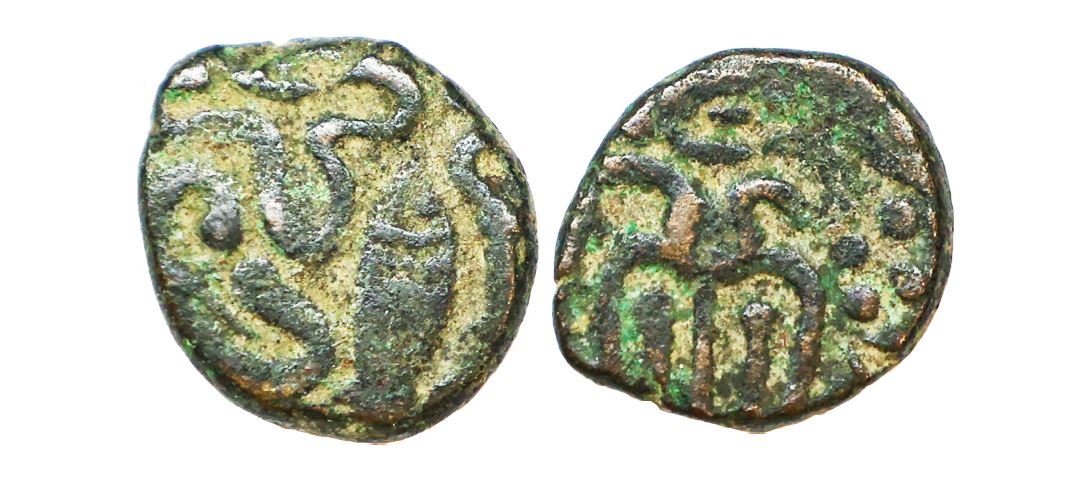 Medieval, Pandyas, Jatavarman Kulasekhara (1190-1216 AD) Copper Unit, 3.15 gms, Obv. Chola style King standing facing, head to right, holding rosebud in his left hand, Rev. Fish and other symbols, fine, very rare.