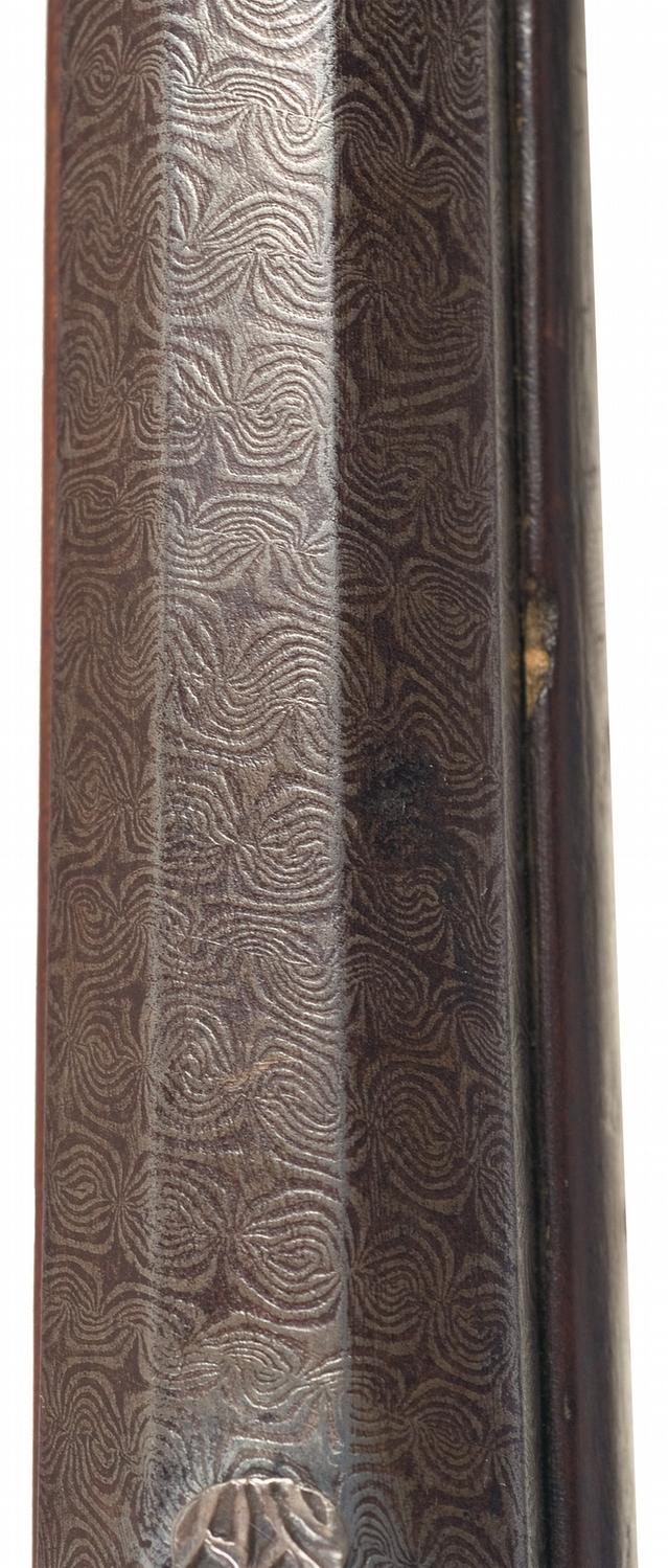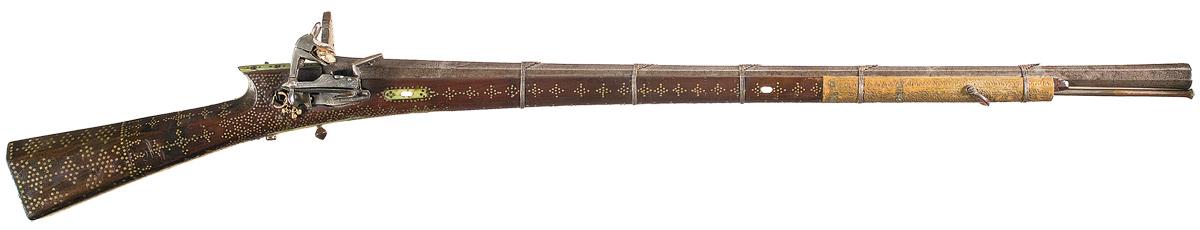 Blade front sight, with a vertical series of 5 peepholes bored into a plate at the breech. The barrel has a strong Damascus twist pattern, with a swamped muzzle, subtle band pattern behind the muzzle, raised designs near the breech and a set of 5 barrel bands with ribbed textures and a floral design on top. Light engraving is present on the miquelet lock, with an iron pyrite igniter, ball trigger, and decorative ring with tiny bells mounted immediately behind the hammer. Smooth straight grip stock, with an engraved brass plate at the tip, ivory escutcheons, green bone panel inlays, a naked butt and extensive brass wire dot inlays.