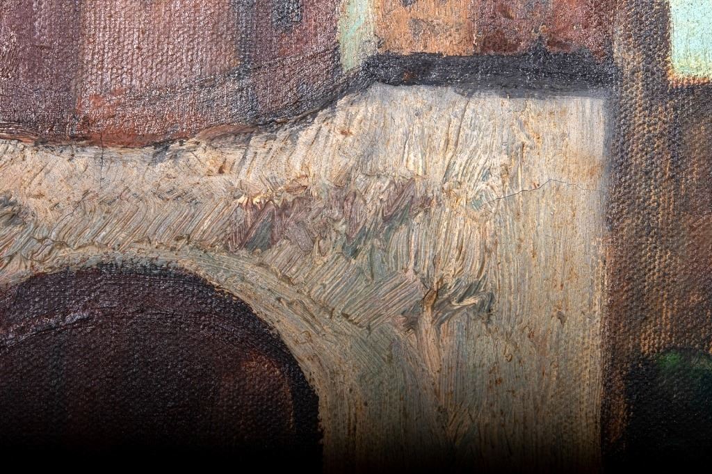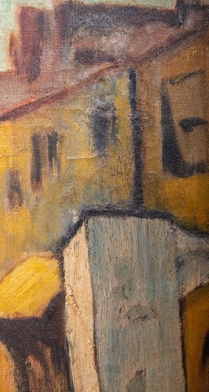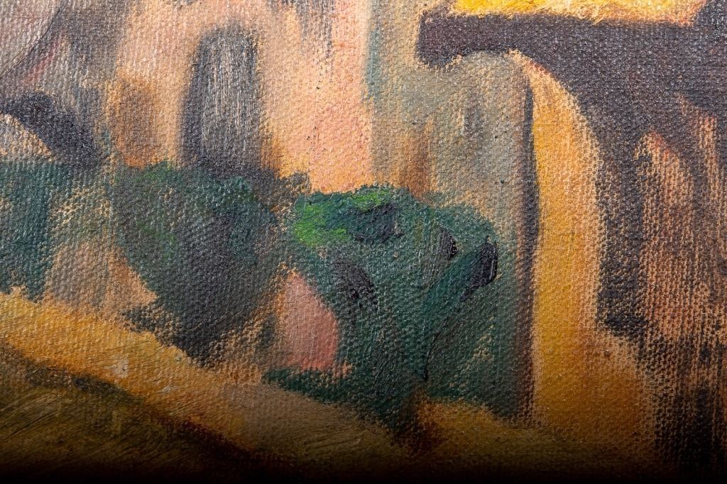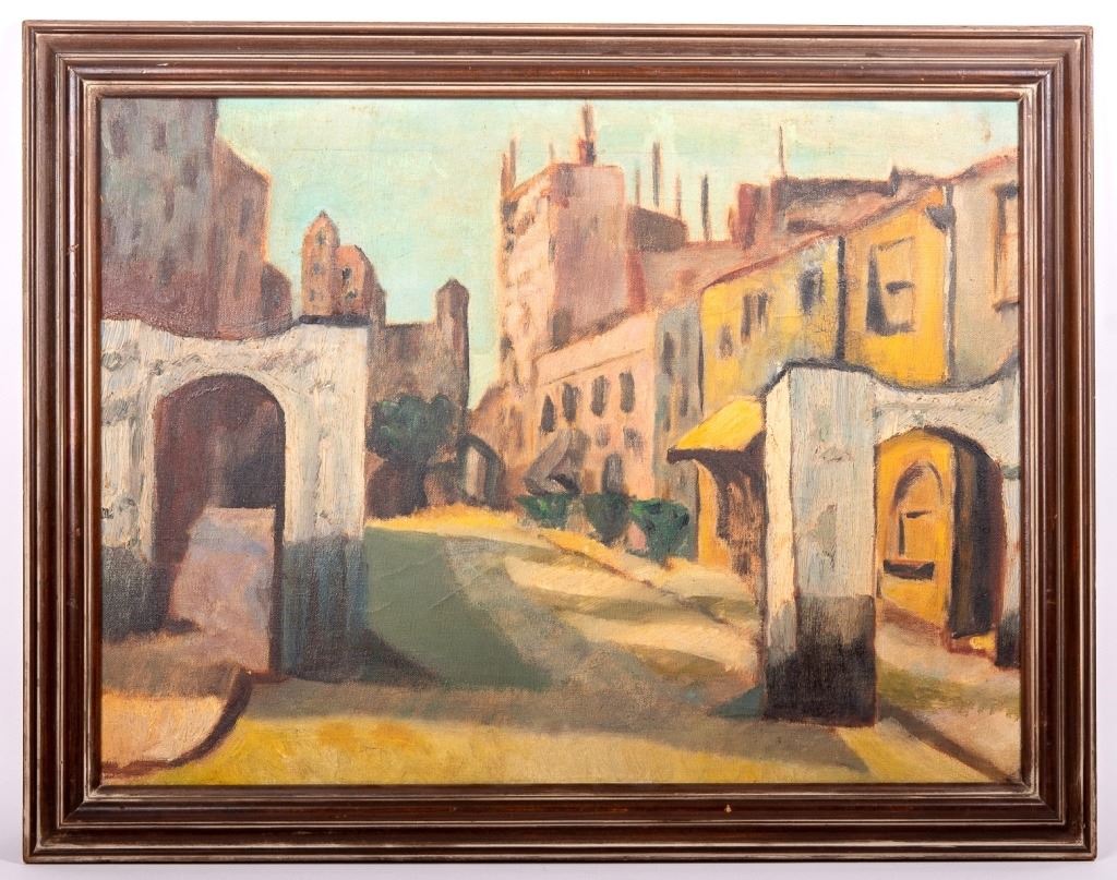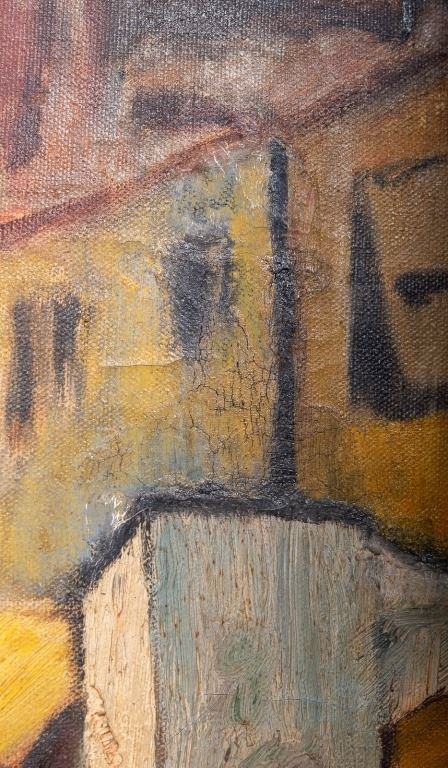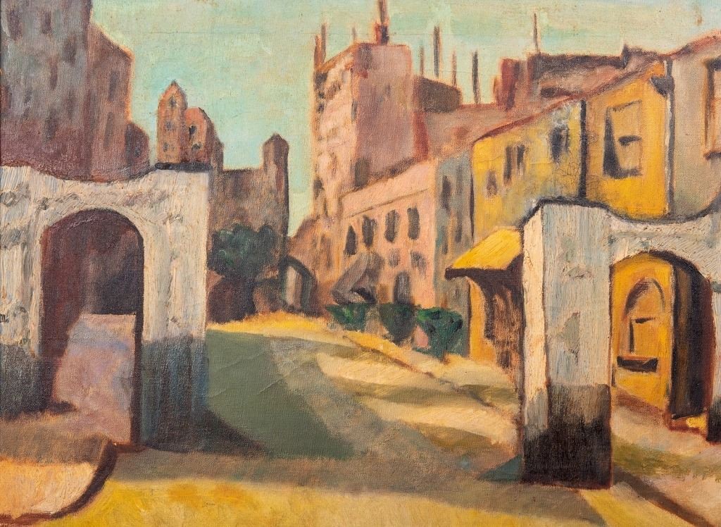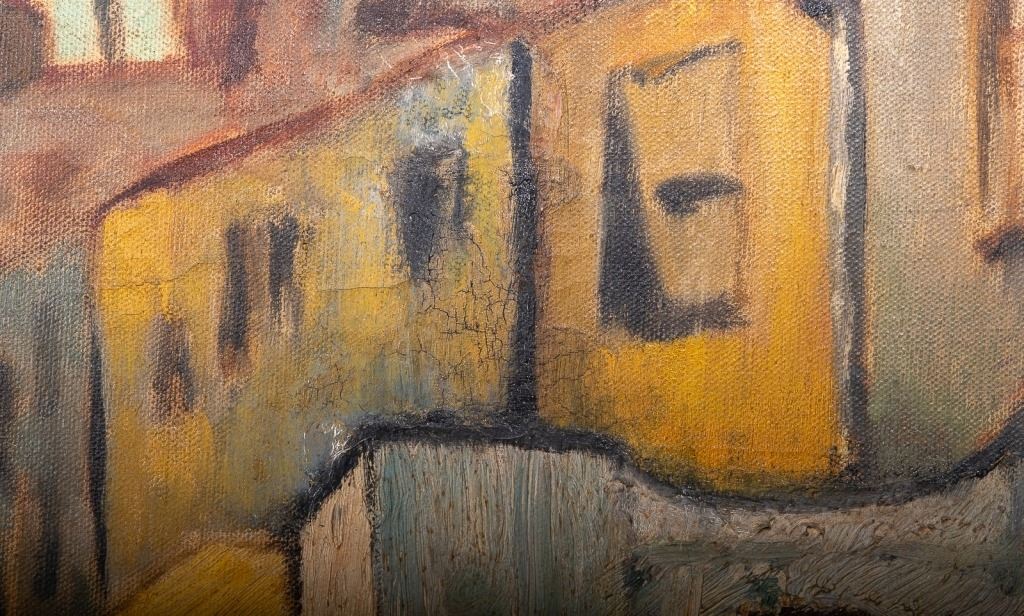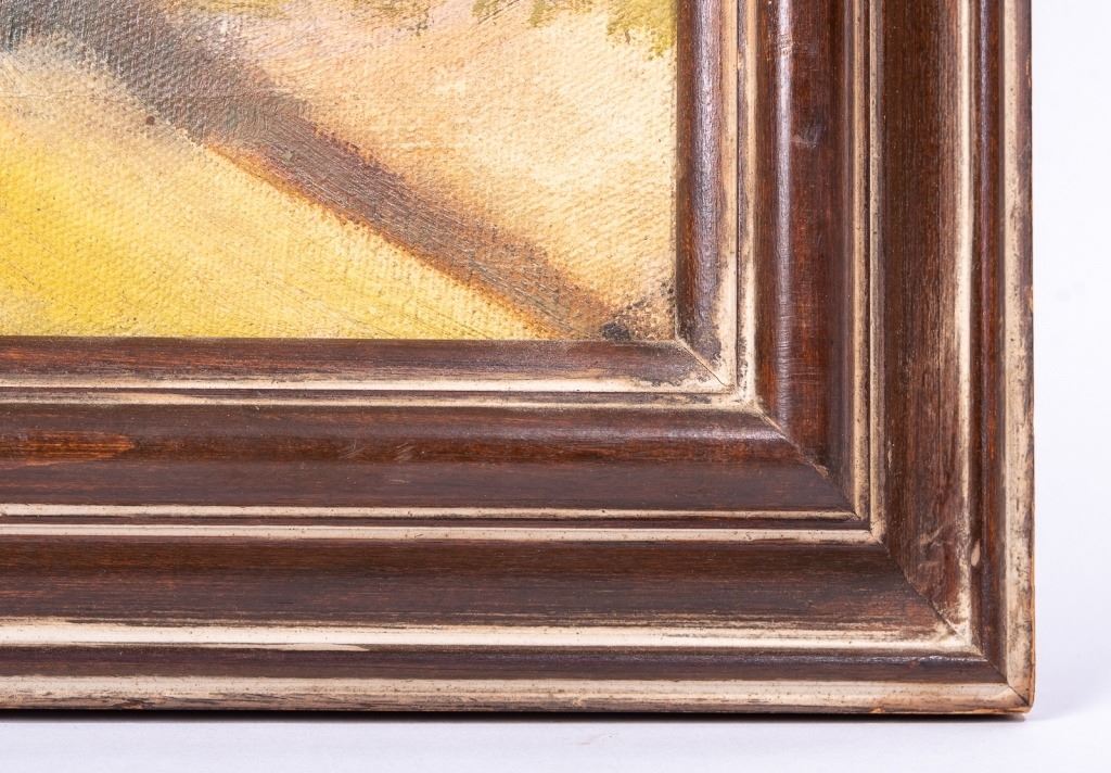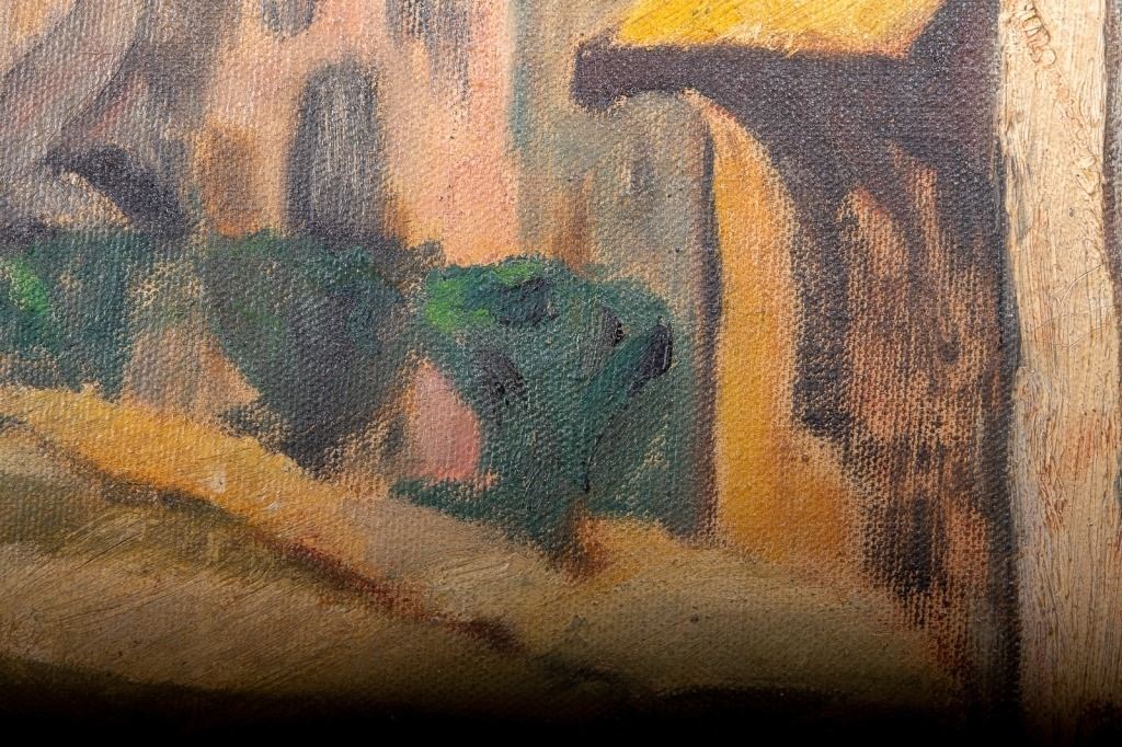 Item/Description: Sun dappled street scene, Mediterranean village. Bold brush strokes, clever use of light and shadows. Frame signed in script en verso: Wiltchik. Stepped painted wooden frame. Hanging wire hardware.