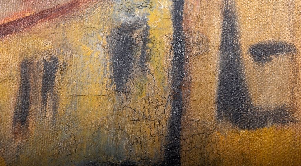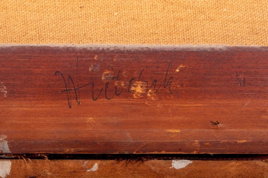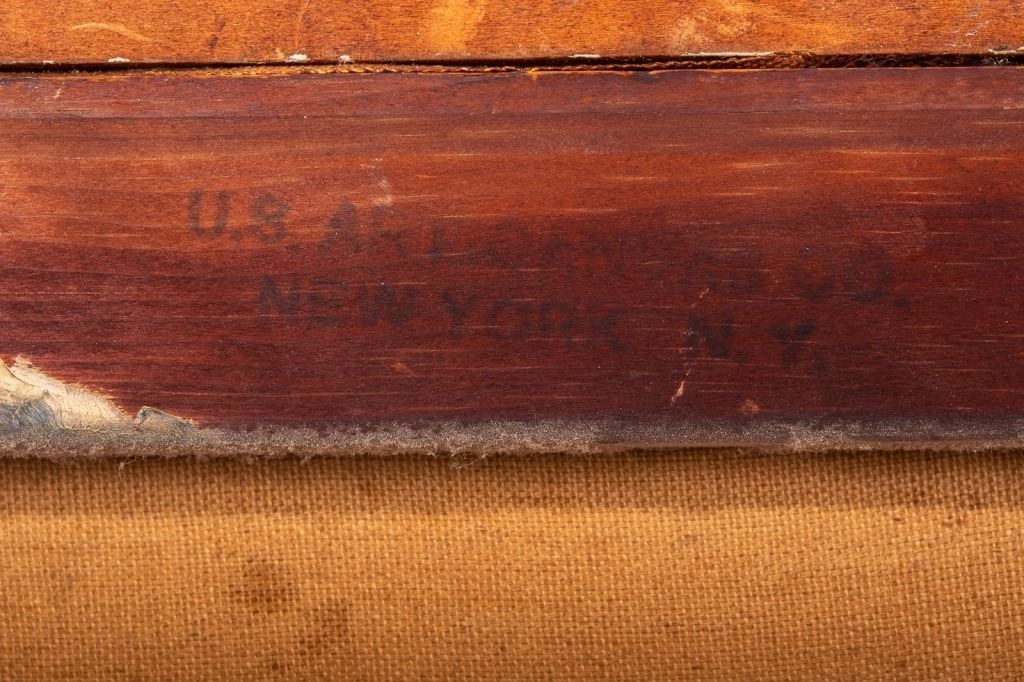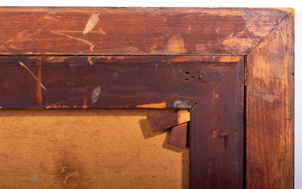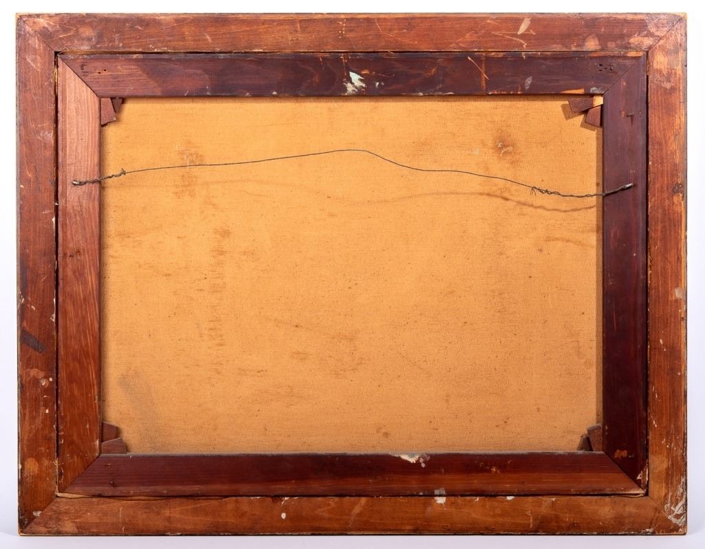 Condition: Very Good. Colors vibrant. Areas of craquelure. Surface wear, minor chipping to frame. Hanging wire hardware intact.