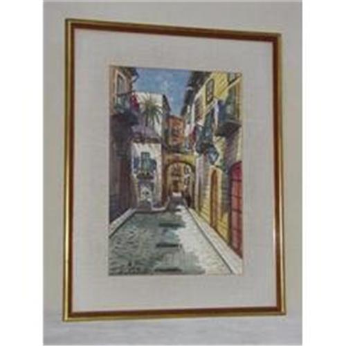 <table width="100%" border="0" cellspacing="0" cellpadding="4"><tr><td><em> </em></td></tr><tr> <td width="100%"> A 20 1/2'' x 26 1/2'' framed watercolor, 12 1/2'' x 18 1/2'' image. Depicting a village street lined with houses, several with balconys and terraces. Cobblestone street with several walking figures. Signed lower left: G.Molina. Linen mat. </td></tr><tr> <td> </td></tr><tr> <td>Reference #: 3016_105</td></tr><tr><td>Condition:good</td></tr><tr><td>Year:Mid 20th Century</td></tr><tr><td>Title:Mediterranean Watercolor SKU3016</td></tr><tr><td>Location:Fort Lauderdale, Florida</td></tr></table>