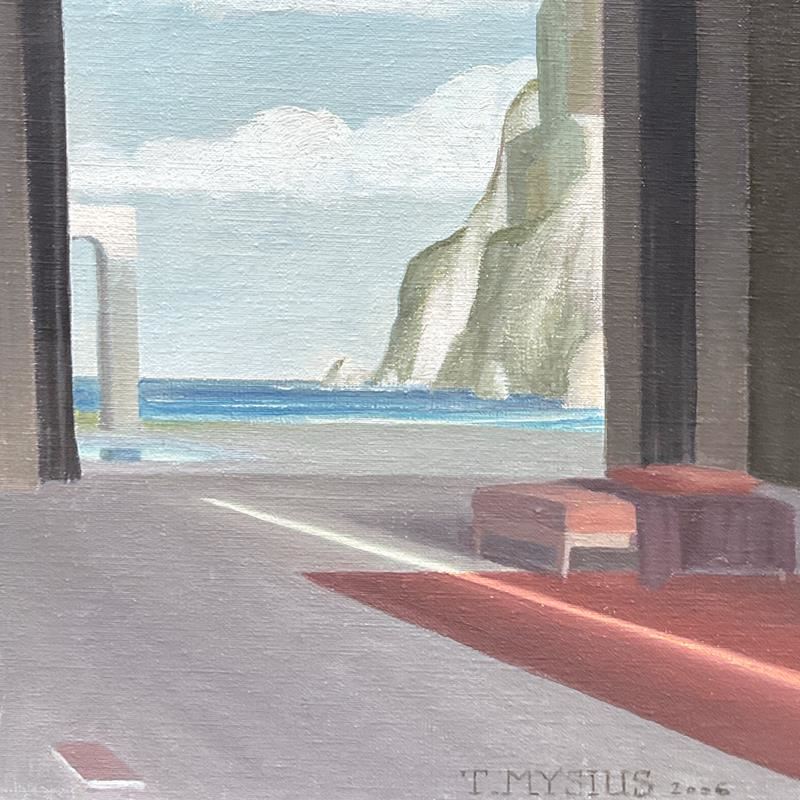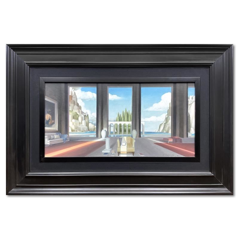 "Meditteranea" is an original oil painting on canvas by Thierry Mysius, hand signed by the artist. This piece comes framed. Includes Letter of Authenticity. Measures approx. 30.5" x 46" (frame), 15.5" x 31" (image). There are very minor scratches on the image that are only noticeable upon close inspection and some wear on the frame.