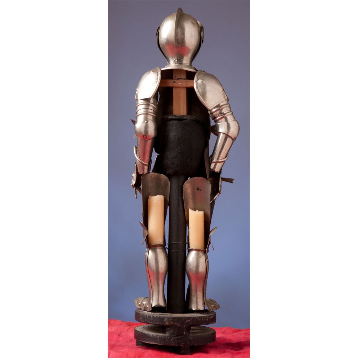 Medium Miniature Suit of Armor. Made with bright metal, the helm of bulbous form and having three vertical view slots on visor. Ribbed elements. Missing greaves. Sold with associated broadsword and scabbard. Mounted on a cylindrical iron base. Height: 19 ½-inches. Condition: Fair to good. Showing age wear and patina. Needs some restoration work.