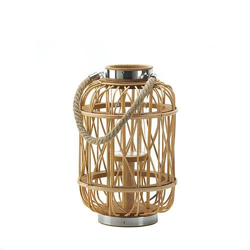 Medium Woven Rattan Candle Lantern **|**|** The natural beauty of this woven rattan candle lantern can only be accentuated by the light of a flickering candle. This medium-sized candle lantern features a candle platform topped by a clear hurricane glass, and is finished with metal banding and a rope handle.Description Details Item weight: 1.6 lbs.Product Dimensions: 8 diameter x 12-5/8" high; 19-1/2" high with handle; glass cylinder: 2-7/8" diameter x 5-7/8" high.Product Material: Rattan, MDF wood, glass, rope and iron.UPC Code: 849179022204.Packaging: 1 EA"