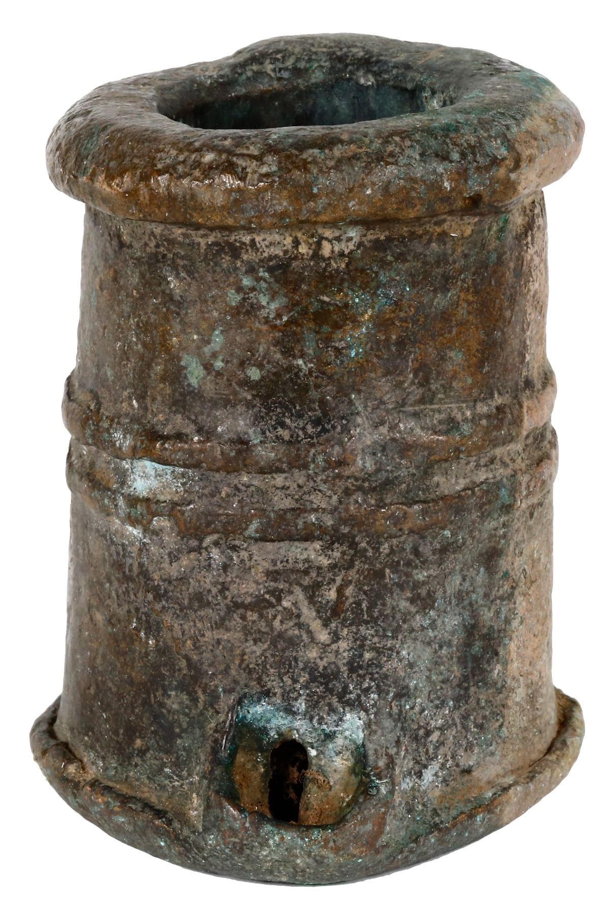 Medium-sized bronze signal cannon (mortar), Spanish colonial (1500s-1600s). 2236 grams. 4" tall, 2¾" diameter. Short, crude, flat-bottomed cannon used to send up signals or to test powder, this one with an elongated touchhole near the bottom, and patinated all over.