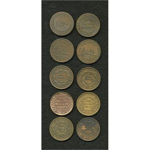 <B>Medley of 10 Hard Times Tokens.</B></I> Ten Hard Times tokens, including <B>Low-58, HT-16, Unc; Low-59, HT-17, XF; Low-62, HT-20, XF; Low-63, HT-21, VF; Low-45, HT-56, XF; Low-46, HT-57, Fine; Low-38, HT-62, VG; Low-47, HT-66, VF; Low-48, HT-67, VF; </B></I>and <B>Low-44, HT-69, XF. </B></I><BR><BR><b>Shipping:</b> Coins & Currency (<a target="_blank" href="http://www.heritageauctions.com/common/shipping.php">view shipping information</a>)