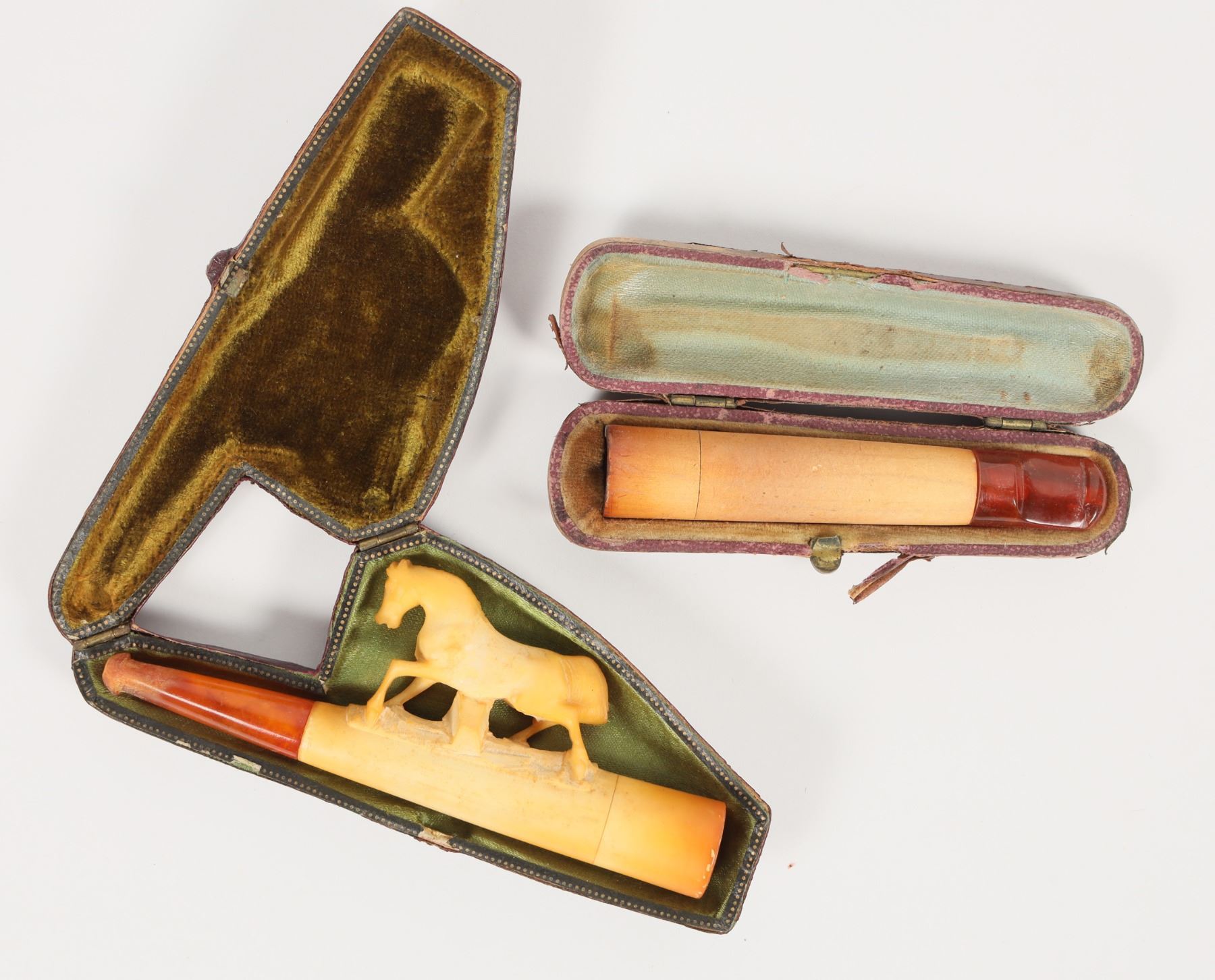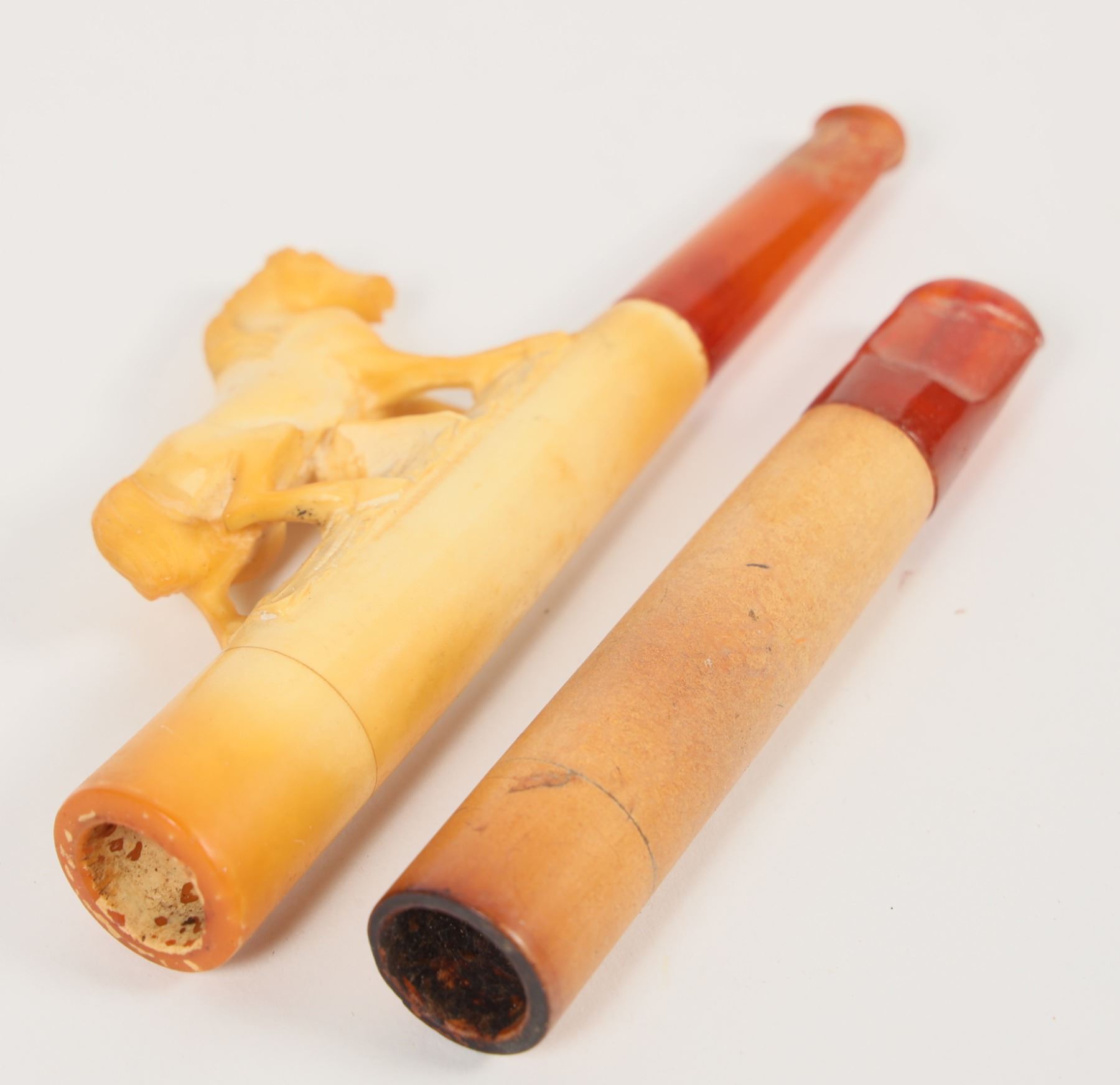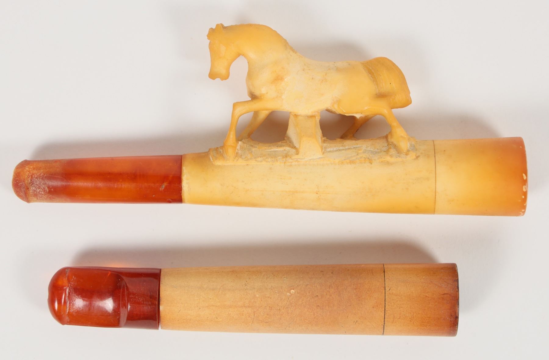 Lot of 3 Two of the holders are in cases. One case has a hand carved horse, and the other is a plain holder with no carvings., The Third is also just a plain holder.