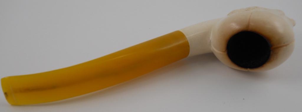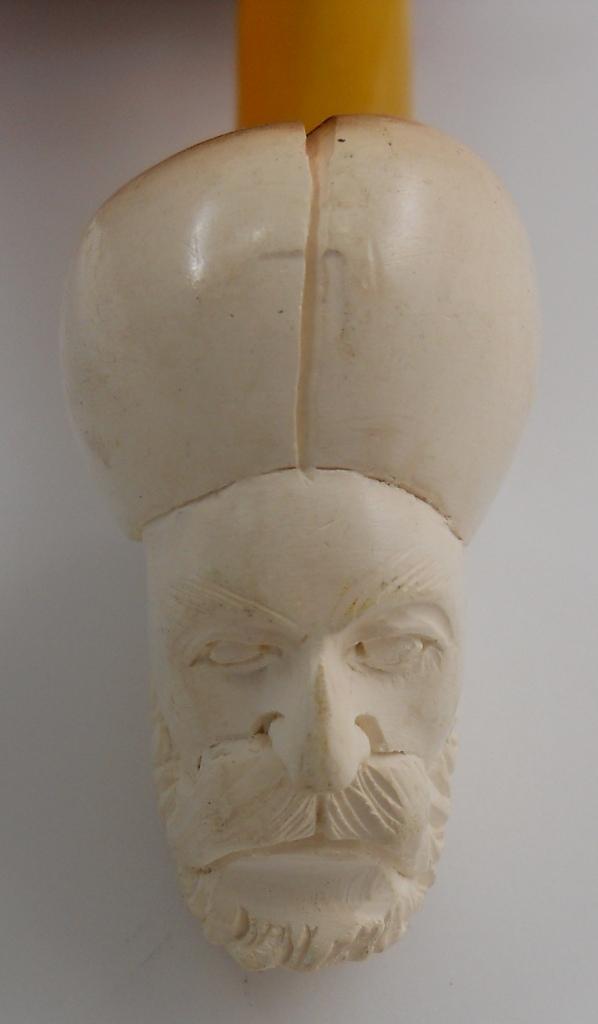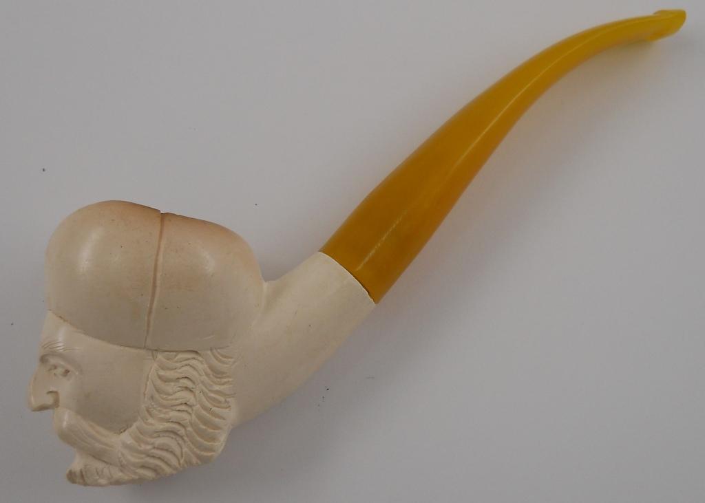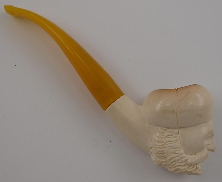 Meerschaum Pipes are the aristocracy of tobacco smoking pipes, produced in many European countries. This pipe has the image of what looks to be a Middle-Eastern man. The carved head bowl is 2-1/2 inches x 1-1/2 inches x 1 inch. The handle is an amber color. This pipe is used, and we have not attempted to clean it.