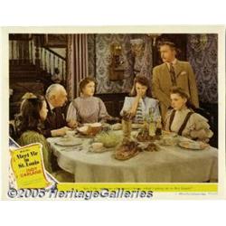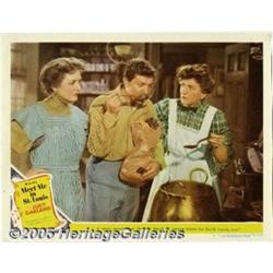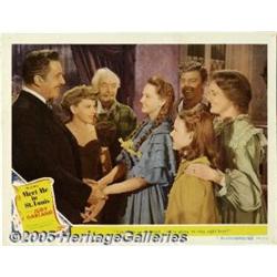 <B>Meet Me in St. Louis (MGM, 1944)</B></I> Lobby Cards (3) (11" X 14"). The banker father of a turn-of-the-century family from St. Louis has just informed his household that they are going to be relocating to New York. This causes emotional trauma to the entire family including daughter Esther (Judy Garland), who is romancing the boy-next-door John Truett (Tom Drake). Offered in this lot are three scene cards from this MGM classic musical. Judy Garland is featured in two of the three. There are pinholes in the corners and light smudge marks, otherwise the cards are in excellent condition. Very Fine. 3 items