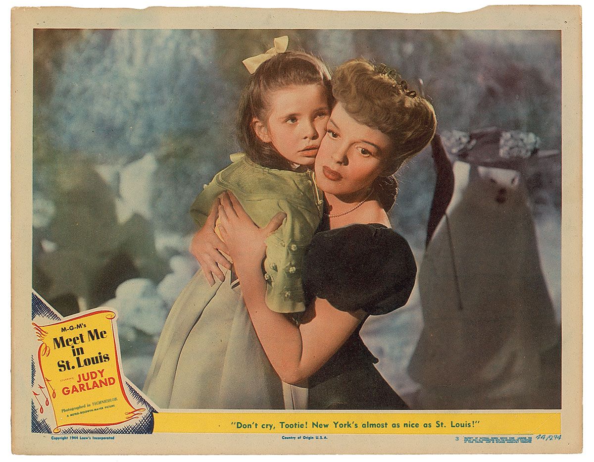 Original color 14 x 11 lobby card for the 1944 film Meet Me in St. Louis, showing Garland comforting the young Margaret O’Brien regarding the family’s move to New York. Irregularly trimmed top edge and tack holes to corners, otherwise fine condition.
