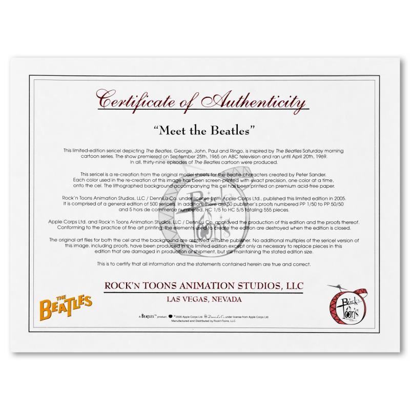 Meet The Beatles by Beatles, The. "Meet The Beatles" is a limited edition sericel inspired by The Beatles Saturday Morning Cartoon series. This piece is from an edition of 500. This piece comes matted. Includes Certificate of Authenticity. Measures approx. 18" x 18" (matting), 14" x 14" (image).