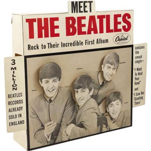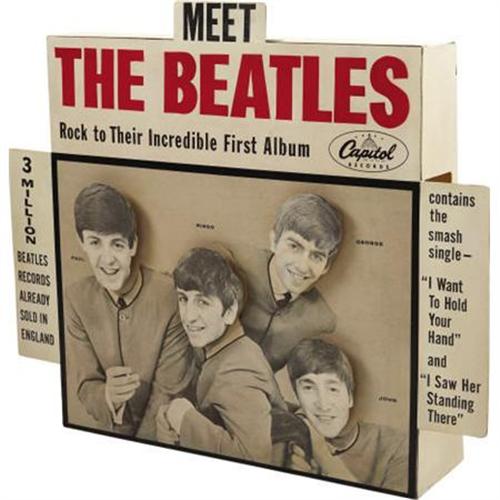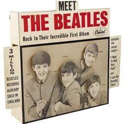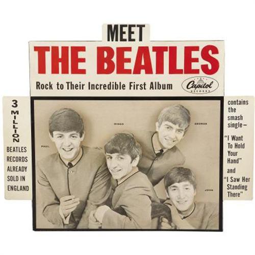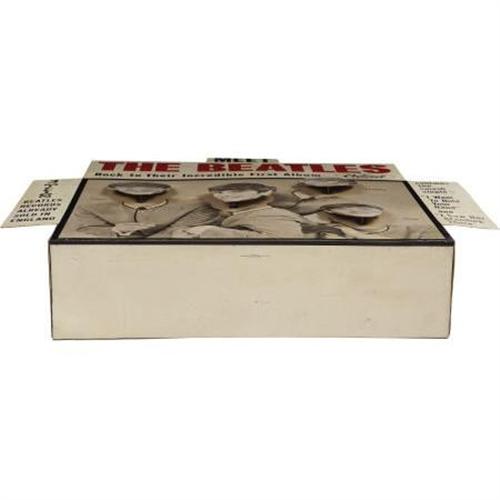 <B><I>Meet the Beatles</B></I></B></I> <B>Moving Head Window Display (Capitol, 1964).</B></I> After a successful year in their native UK, the Beatles finally broke big in America. Capitol Records was initially resistant of the group, but the infectious sound of "Yeah Yeah Yeah" caused the company to do a complete turnabout, resulting in a huge promotional campaign for their first US album, a reworked version of the boys second UK long player. Titled <I>Meet the Beatles,</B></I> the album took off in the early days of 1964, and it promptly knocked everyone on their collective heads, young and old alike. Finding early promo material for <I>Meet the Beatles</B></I> is tough, especially this incredible piece. Designed as a window display, this large cardboard stand-up features a famous photo of the band in their collarless suits -- note the cigarette in Paul's hand, which was later airbrushed out for use on a picture sleeve. The heads of Paul, Ringo, George, and John were die-cut and sit about a half-inch from the display; a battery-operated mechanical device in the back causes the heads to sway back and forth. It's easy to imagine a group of teenage girls gathered outside a record store window, swooning to the swaying Mop Top heads! Displays such as this were sent to select radio stations and retail outlets in early February 1964. It measures approximately 30.75" x 25.5" x 6". These coveted displays rarely survive, as most were ruined by direct exposure to sun, and the few that are still around are usually missing at least one head. This item is complete and in good working order; however, it was extensively and professionally restored to its current Excellent condition. It will be a standout item in even the most complete Beatles collection, and is sure to cause some spirited bidding. Go to our website for images of the piece from different angles.<BR><BR><b>Shipping:</b> Flat Material, Large (<a target="_blank" href="http://www.heritageauctions.com/common/shipping.php">view shipping information</a>)